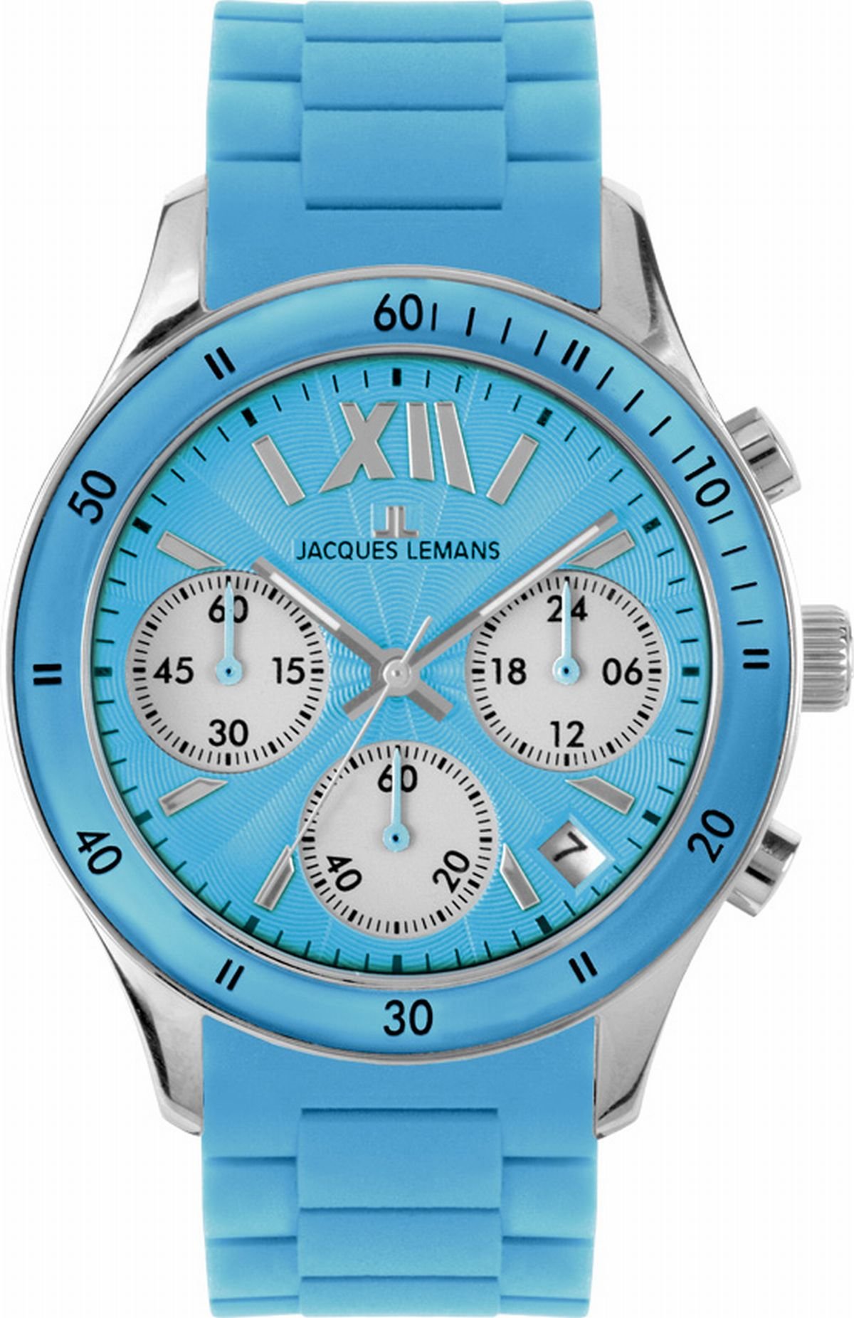 Figure 1: Jacques Lemans 1-1586L Rome Sports Chronograph Watch. This image displays the watch with its blue dial, chronograph subdials, and silicone strap.