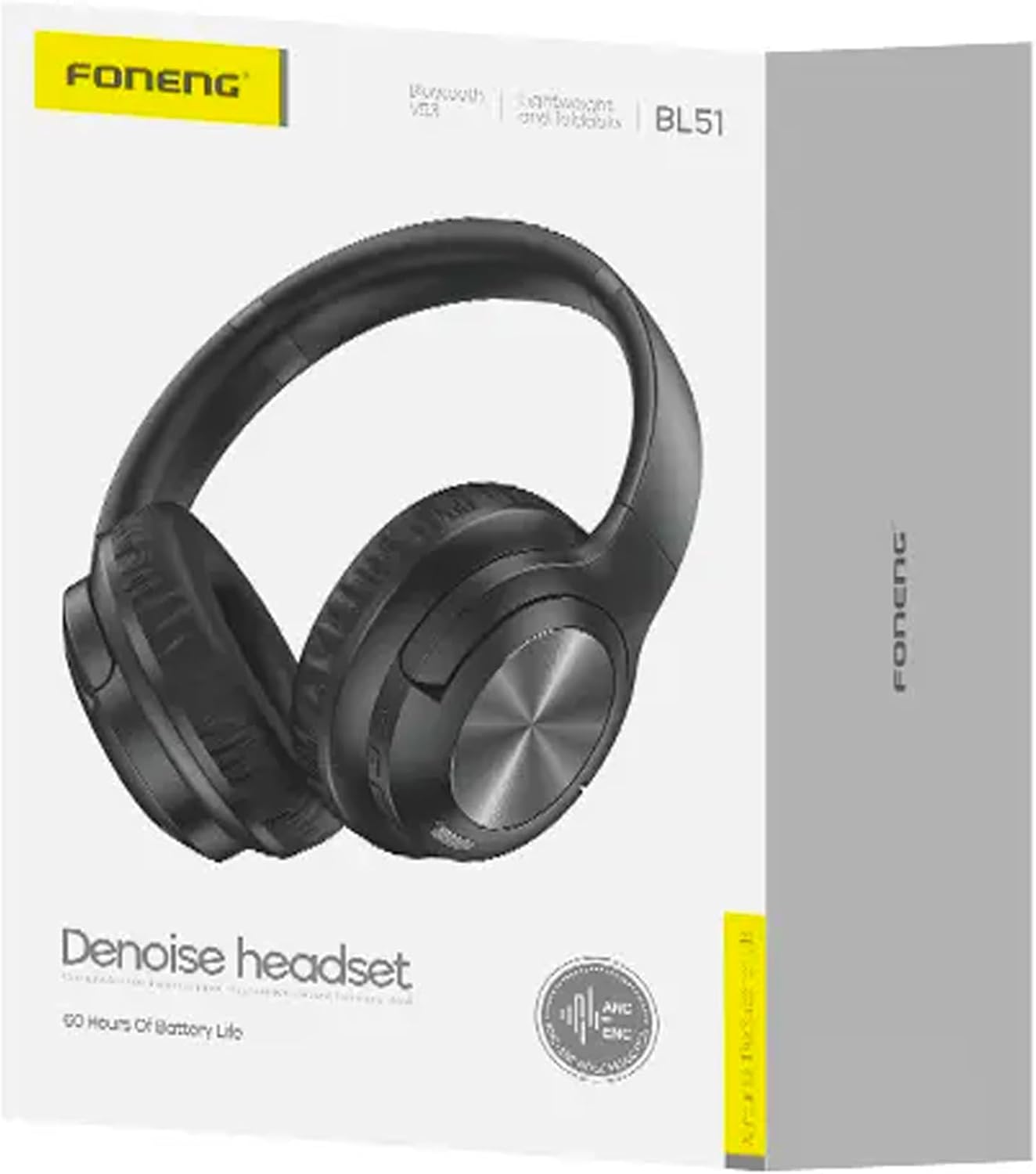 Image : Les écouteurs Foneng BL51 sont présentés avec des superpositions de texte mettant en évidence « ANC (annulation active du bruit) » et « ENC (réduction du bruit lors des appels) », illustrant la double technologie de réduction du bruit.